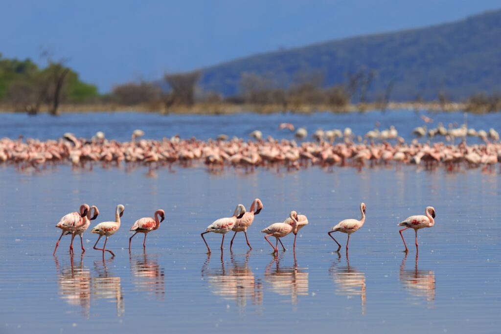 Adding a touch of colour to your safari, flamingos gather in thousands at soda lakes, creating a breathtaking pink spectacle.